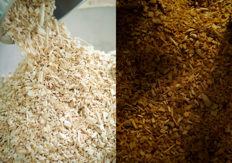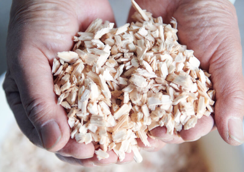 伐採したひのき原木は製材され、2週間程乾燥させます。そして機械によってチップにしたひのきをすべて手作業でふるいにかけ、規定の大きさに合ったチップのみをひのき水に使用します。