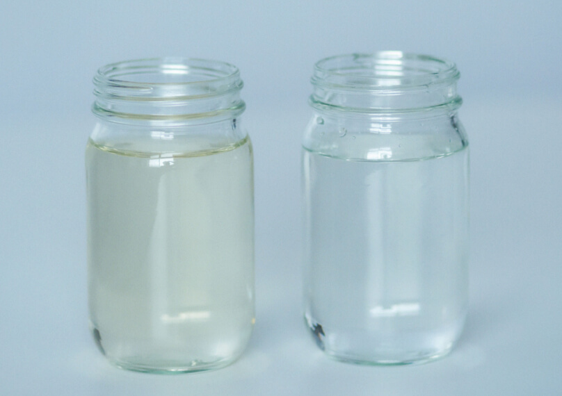 混合物を含んだ抽出水(左)には色味が含まれており、蒸留することでこの混合物を分離し、透明な精製水(右)になります。