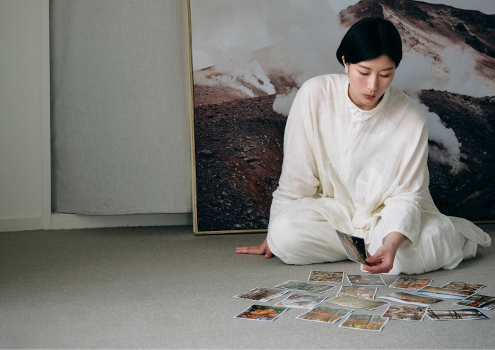 山の澄み切った空気感や、遠くの景色を眺めた時のまぶしくてぼんやりとした視界。集めた景色たちを思い出すような感覚やその土地での空気感を表現しています。